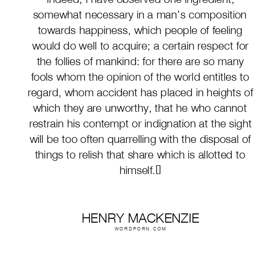 Indeed, I have observed one ingredient, somewhat necessary in a man’s composition towards happiness, which people of feeling would do well to acquire; a certain respect for the follies of mankind: for there are so many fools whom the opinion of the world entitles to regard, whom accident has placed in heights of which they are unworthy, that he who cannot restrain his contempt or indignation at the sight will be too often quarrelling with the disposal of things to relish that share which is allotted to himself.