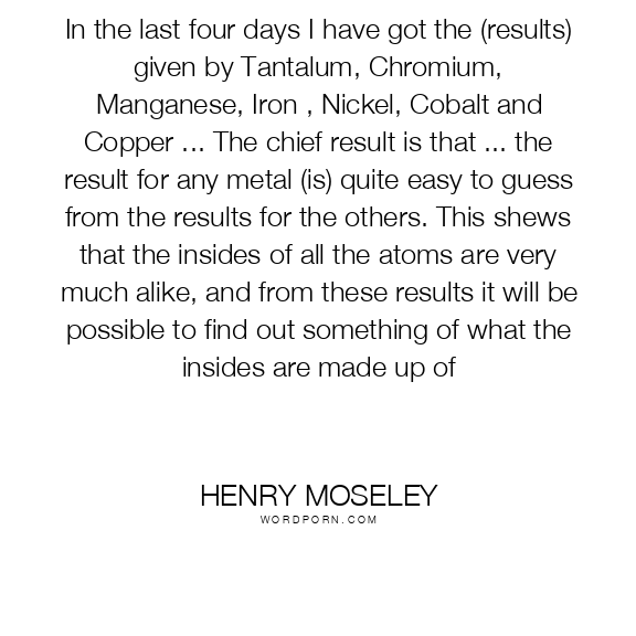 In the last four days I have got the (results) given by Tantalum, Chromium, Manganese, Iron , Nickel, Cobalt and Copper ... The chief result is that ... the result for any metal (is) quite easy to guess from the results for the others. This shews that the insides of all the atoms are very much alike, and from these results it will be possible to find out something of what the insides are made up of