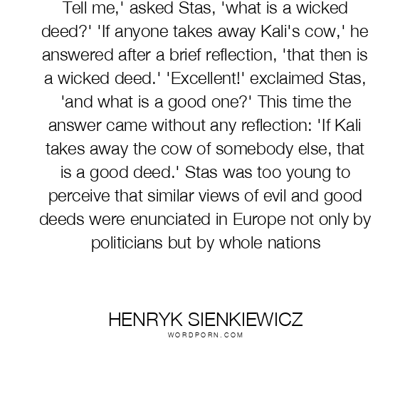 Tell me,' asked Stas, 'what is a wicked deed?' 'If anyone takes away Kali's cow,' he answered after a brief reflection, 'that then is a wicked deed.' 'Excellent!' exclaimed Stas, 'and what is a good one?' This time the answer came without any reflection: 'If Kali takes away the cow of somebody else, that is a good deed.' Stas was too young to perceive that similar views of evil and good deeds were enunciated in Europe not only by politicians but by whole nations