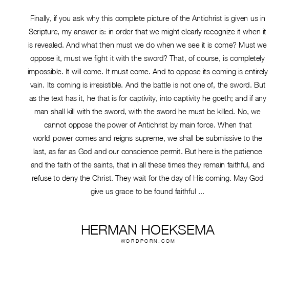 Finally, if you ask why this complete picture of the Antichrist is given us in Scripture, my answer is: in order that we might clearly recognize it when it is revealed. And what then must we do when we see it is come? Must we oppose it, must we fight it with the sword? That, of course, is completely impossible. It will come. It must come. And to oppose its coming is entirely vain. Its coming is irresistible. And the battle is not one of, the sword. But as the text has it, he that is for captivity, into captivity he goeth; and if any man shall kill with the sword, with the sword he must be killed. No, we cannot oppose the power of Antichrist by main force. When that world-power comes and reigns supreme, we shall be submissive to the last, as far as God and our conscience permit. But here is the patience and the faith of the saints, that in all these times they remain faithful, and refuse to deny the Christ. They wait for the day of His coming. May God give us grace to be found faithful at all times, and watching and praying, so that no one may take our crown