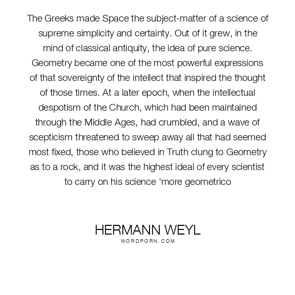 The Greeks made Space the subject-matter of a science of supreme simplicity and certainty. Out of it grew, in the mind of classical antiquity, the idea of pure science. Geometry became one of the most powerful expressions of that sovereignty of the intellect that inspired the thought of those times. At a later epoch, when the intellectual despotism of the Church, which had been maintained through the Middle Ages, had crumbled, and a wave of scepticism threatened to sweep away all that had seemed most fixed, those who believed in Truth clung to Geometry as to a rock, and it was the highest ideal of every scientist to carry on his science 'more geometrico