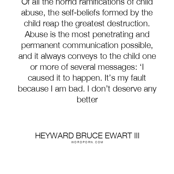 Of all the horrid ramifications of child abuse, the self-beliefs formed by the child reap the greatest destruction. Abuse is the most penetrating and permanent communication possible, and it always conveys to the child one or more of several messages: ‘I caused it to happen. It’s my fault because I am bad. I don’t deserve any better