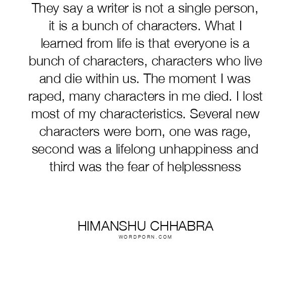 They say a writer is not a single person, it is a bunch of characters. What I learned from life is that everyone is a bunch of characters, characters who live and die within us. The moment I was raped, many characters in me died. I lost most of my characteristics. Several new characters were born, one was rage, second was a lifelong unhappiness and third was the fear of helplessness