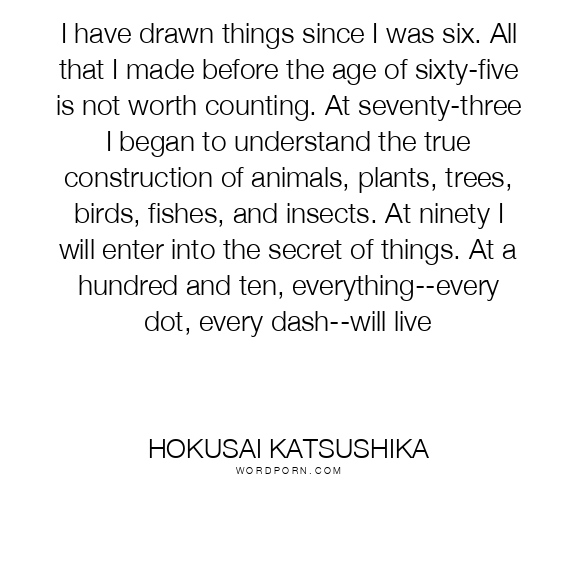 I have drawn things since I was six. All that I made before the age of sixty-five is not worth counting. At seventy-three I began to understand the true construction of animals, plants, trees, birds, fishes, and insects. At ninety I will enter into the secret of things. At a hundred and ten, everything--every dot, every dash--will live