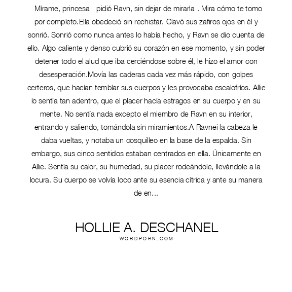 - Mírame, princesa - pidió Ravn, sin dejar de mirarla-. Mira cómo te tomo por completo.Ella obedeció sin rechistar. Clavó sus zafiros ojos en él y sonrió. Sonrió como nunca antes lo había hecho, y Ravn se dio cuenta de ello. Algo caliente y denso cubrió su corazón en ese momento, y sin poder detener todo el alud que iba cerciéndose sobre él, le hizo el amor con desesperación.Movía las caderas cada vez más rápido, con golpes certeros, que hacían temblar sus cuerpos y les provocaba escalofríos. Allie lo sentía tan adentro, que el placer hacía estragos en su cuerpo y en su mente. No sentía nada excepto el miembro de Ravn en su interior, entrando y saliendo, tomándola sin miramientos.A Ravnei la cabeza le daba vueltas, y notaba un cosquilleo en la base de la espalda. Sin embargo, sus cinco sentidos estaban centrados en ella. Únicamente en Allie. Sentía su calor, su humedad, su placer rodeándole, llevándole a la locura. Su cuerpo se volvía loco ante su esencia cítrica y ante su manera de entregarse, y cada vez embestía mucho más profundo. Miró su rostro, y no pudo evitar sonreír de felicidad. Allie volvía a estar con él, por completo, sin excepción. Era demasiado para un bastardo como él, pero no la dejaría ir. Nunca más. Lucharía por ella todo lo que hiciera falta, contra viento y marea, hasta que le perdonase por completo y aceptara pasar el resto de sus días a su lado. Sí, haría eso.Atrapó su labio inferior entre sus dientes y mordisqueó. Allie echó la cabeza hacia atrás, abrazándose más a él. Incapaz de soltarse por miedo a perderse en la oscuridad. Ya no sentía nada que no fuera Ravn y su aplastante presencia. - Eres preciosa, Alyson. Nunca dudes de eso - susurró sobre su oído. - No si tú sigues recordándomelo - contestó acunándolo. - Lo haré, princesa. Nunca te dejaría caer en este oscuro y frío mundo. Ella le acarició las mejillas, encendida por esa forma que tenía de tratarla, tan cercana y cálida.- ¿De verdad?- Sí. Yo te resguardaré cuando llueva, ¿lo recuerdas? Siempre, Alyson. Siempre. Da igual cuántas tormentas vengan, yo seré...- Mi paraguas - terminó por él, y no pudo mas que abrazarlo con fuerza. ♥[Allie y Ravn. Mi parejita adorable. Pg 174-175]