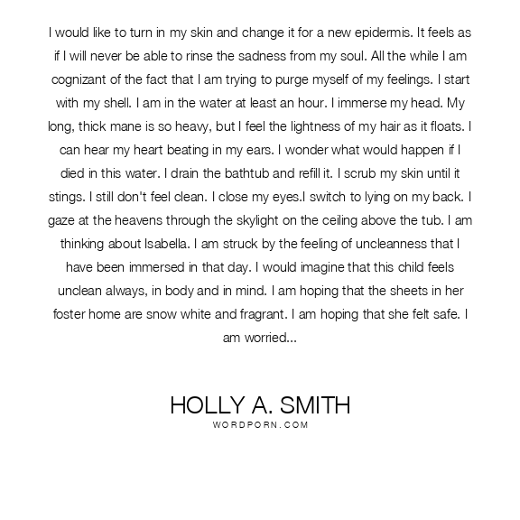 I would like to turn in my skin and change it for a new epidermis. It feels as if I will never be able to rinse the sadness from my soul. All the while I am cognizant of the fact that I am trying to purge myself of my feelings. I start with my shell. I am in the water at least an hour. I immerse my head. My long, thick mane is so heavy, but I feel the lightness of my hair as it floats. I can hear my heart beating in my ears. I wonder what would happen if I died in this water. I drain the bathtub and refill it. I scrub my skin until it stings. I still don't feel clean. I close my eyes.I switch to lying on my back. I gaze at the heavens through the skylight on the ceiling above the tub. I am thinking about Isabella. I am struck by the feeling of uncleanness that I have been immersed in that day. I would imagine that this child feels unclean always, in body and in mind. I am hoping that the sheets in her foster home are snow white and fragrant. I am hoping that she felt safe. I am worried that she is so deeply alone and frightened. I know somewhere deep inside of me that the decisions and choices I made today were sound. I am praying, with eyes glued to the stars, that I will not awaken in the night with my heart beating out of my chest; that I will not be haunted by Francis's diseased body; that I will not perseverate on ever nuance of my day - the smells, the cockroaches, the piercing torment of Isabella's unseeing eye, her father's sore-ridden penis penetrating her tiny body. Yet in many ways this is an experience I hope never to forget. The pearls. I must not forget the pearls that I have promised her