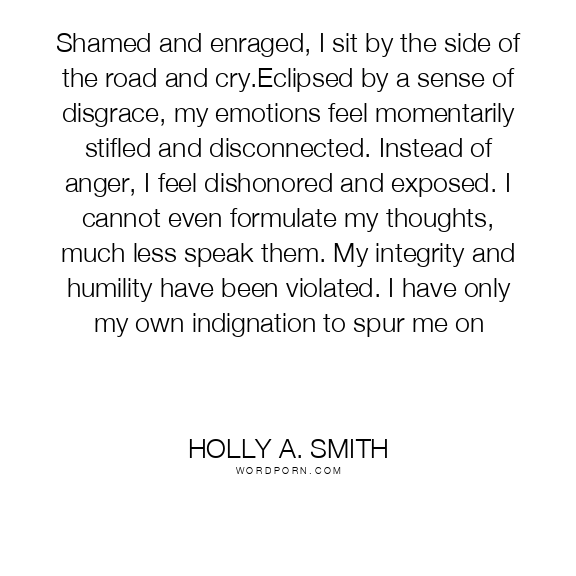 Shamed and enraged, I sit by the side of the road and cry.Eclipsed by a sense of disgrace, my emotions feel momentarily stifled and disconnected. Instead of anger, I feel dishonored and exposed. I cannot even formulate my thoughts, much less speak them. My integrity and humility have been violated. I have only my own indignation to spur me on