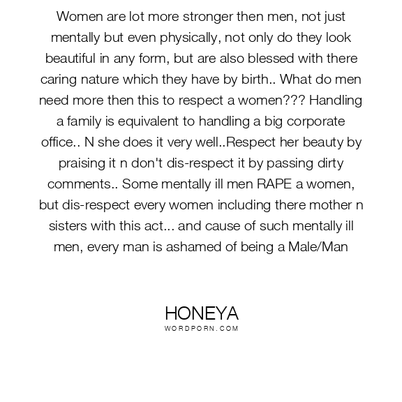 Women are lot more stronger then men, not just mentally but even physically, not only do they look beautiful in any form, but are also blessed with there caring nature which they have by birth.. What do men need more then this to respect a women??? Handling a family is equivalent to handling a big corporate office.. N she does it very well..Respect her beauty by praising it n don't dis-respect it by passing dirty comments.. Some mentally ill men RAPE a women, but dis-respect every women including there mother n sisters with this act... and cause of such mentally ill men, every man is ashamed of being a Male/Man