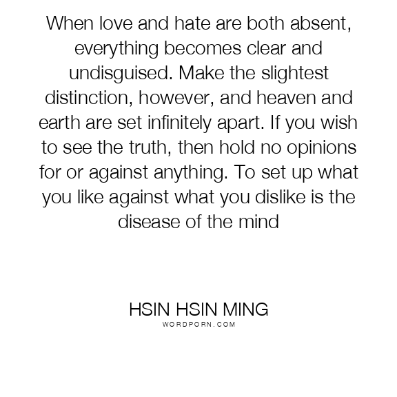 When love and hate are both absent, everything becomes clear and undisguised. Make the slightest distinction, however, and heaven and earth are set infinitely apart. If you wish to see the truth, then hold no opinions for or against anything. To set up what you like against what you dislike is the disease of the mind