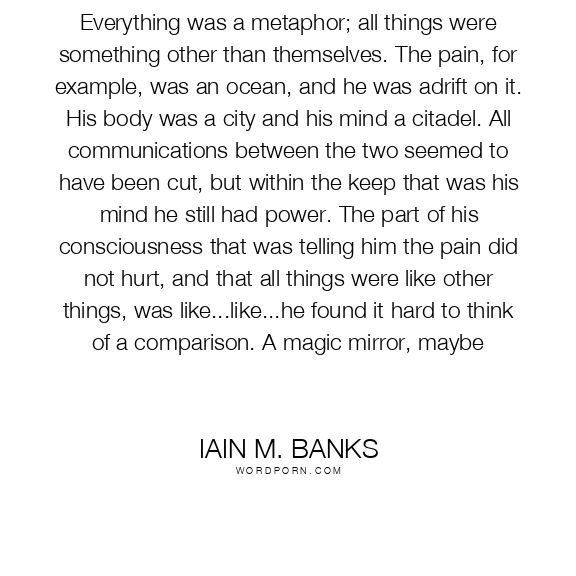Everything was a metaphor; all things were something other than themselves. The pain, for example, was an ocean, and he was adrift on it. His body was a city and his mind a citadel. All communications between the two seemed to have been cut, but within the keep that was his mind he still had power. The part of his consciousness that was telling him the pain did not hurt, and that all things were like other things, was like...like...he found it hard to think of a comparison. A magic mirror, maybe