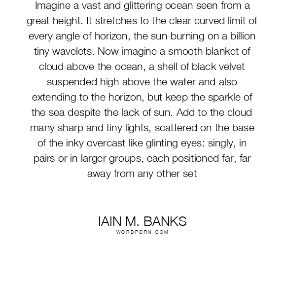 Imagine a vast and glittering ocean seen from a great height. It stretches to the clear curved limit of every angle of horizon, the sun burning on a billion tiny wavelets. Now imagine a smooth blanket of cloud above the ocean, a shell of black velvet suspended high above the water and also extending to the horizon, but keep the sparkle of the sea despite the lack of sun. Add to the cloud many sharp and tiny lights, scattered on the base of the inky overcast like glinting eyes: singly, in pairs or in larger groups, each positioned far, far away from any other set