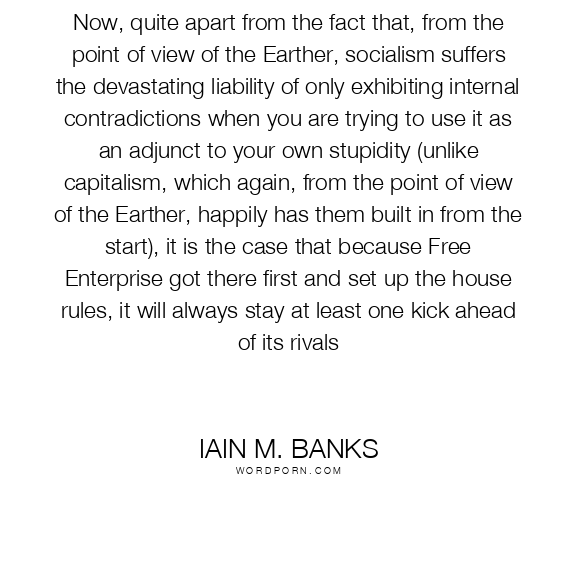 Now, quite apart from the fact that, from the point of view of the Earther, socialism suffers the devastating liability of only exhibiting internal contradictions when you are trying to use it as an adjunct to your own stupidity (unlike capitalism, which again, from the point of view of the Earther, happily has them built in from the start), it is the case that because Free Enterprise got there first and set up the house rules, it will always stay at least one kick ahead of its rivals
