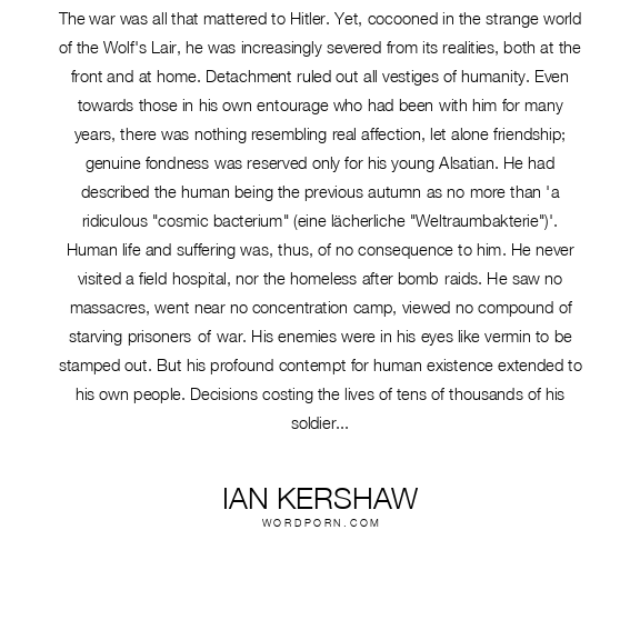 The war was all that mattered to Hitler. Yet, cocooned in the strange world of the Wolf's Lair, he was increasingly severed from its realities, both at the front and at home. Detachment ruled out all vestiges of humanity. Even towards those in his own entourage who had been with him for many years, there was nothing resembling real affection, let alone friendship; genuine fondness was reserved only for his young Alsatian. He had described the human being the previous autumn as no more than 'a ridiculous "cosmic bacterium" (eine lächerliche "Weltraumbakterie")'. Human life and suffering was, thus, of no consequence to him. He never visited a field-hospital, nor the homeless after bomb-raids. He saw no massacres, went near no concentration camp, viewed no compound of starving prisoners-of-war. His enemies were in his eyes like vermin to be stamped out. But his profound contempt for human existence extended to his own people. Decisions costing the lives of tens of thousands of his soldiers were made — perhaps it was only thus possible to make them — without consideration for any human plight. As he had told Guderian during the winter crisis, feelings of sympathy and pity for the suffering of his soldiers had to be shut out. For Hitler, the hundreds of thousands of dead and maimed were merely an abstraction, the suffering a necessary and justified sacrifice in the 'heroic struggle' for the survival of the people