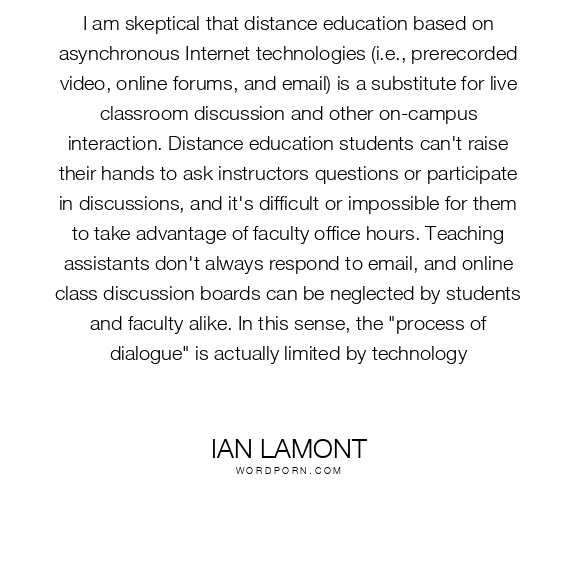 I am skeptical that distance education based on asynchronous Internet technologies (i.e., prerecorded video, online forums, and email) is a substitute for live classroom discussion and other on-campus interaction. Distance education students can't raise their hands to ask instructors questions or participate in discussions, and it's difficult or impossible for them to take advantage of faculty office hours. Teaching assistants don't always respond to email, and online class discussion boards can be neglected by students and faculty alike. In this sense, the "process of dialogue" is actually limited by technology
