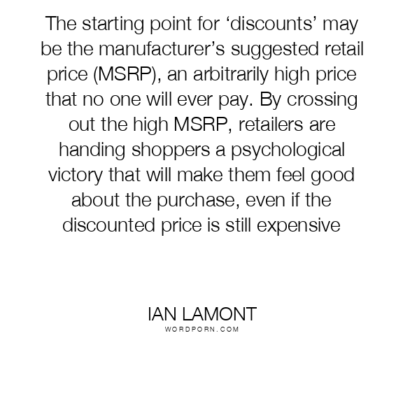 The starting point for ‘discounts’ may be the manufacturer’s suggested retail price (MSRP), an arbitrarily high price that no one will ever pay. By crossing out the high MSRP, retailers are handing shoppers a psychological victory that will make them feel good about the purchase, even if the discounted price is still expensive