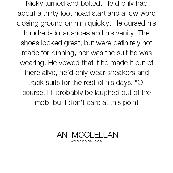 Nicky turned and bolted. He’d only had about a thirty foot head start and a few were closing ground on him quickly. He cursed his hundred-dollar shoes and his vanity. The shoes looked great, but were definitely not made for running, nor was the suit he was wearing. He vowed that if he made it out of there alive, he’d only wear sneakers and track suits for the rest of his days. "Of course, I’ll probably be laughed out of the mob, but I don’t care at this point