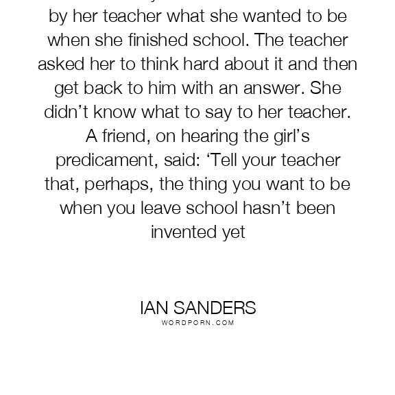 A friend’s 14-year-old niece was asked by her teacher what she wanted to be when she finished school. The teacher asked her to think hard about it and then get back to him with an answer. She didn’t know what to say to her teacher. A friend, on hearing the girl’s predicament, said: ‘Tell your teacher that, perhaps, the thing you want to be when you leave school hasn’t been invented yet