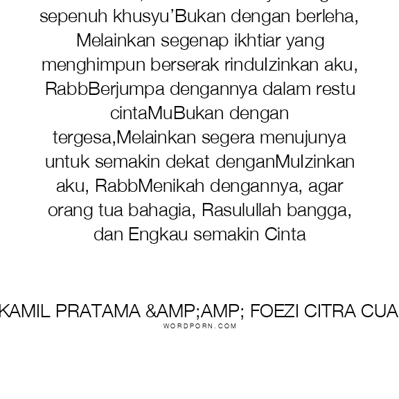 Izinkan aku, RabbMenantinya dengan sepenuh khusyu’Bukan dengan berleha, Melainkan segenap ikhtiar yang menghimpun berserak rinduIzinkan aku, RabbBerjumpa dengannya dalam restu cintaMuBukan dengan tergesa,Melainkan segera menujunya untuk semakin dekat denganMuIzinkan aku, RabbMenikah dengannya, agar orang tua bahagia, Rasulullah bangga, dan Engkau semakin Cinta
