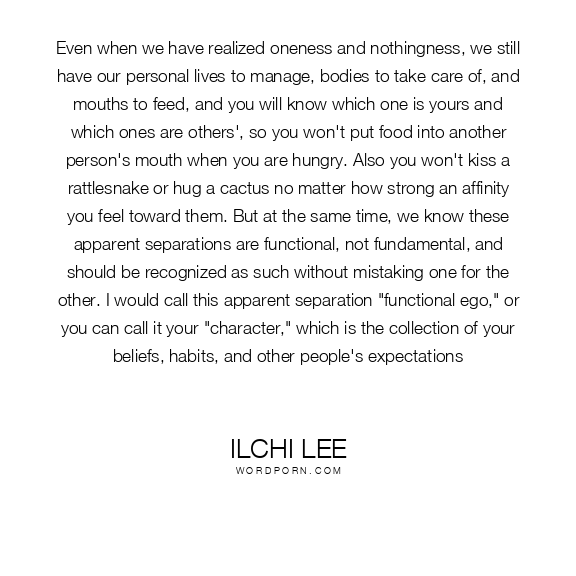 Even when we have realized oneness and nothingness, we still have our personal lives to manage, bodies to take care of, and mouths to feed, and you will know which one is yours and which ones are others', so you won't put food into another person's mouth when you are hungry. Also you won't kiss a rattlesnake or hug a cactus no matter how strong an affinity you feel toward them. But at the same time, we know these apparent separations are functional, not fundamental, and should be recognized as such without mistaking one for the other. I would call this apparent separation "functional ego," or you can call it your "character," which is the collection of your beliefs, habits, and other people's expectations