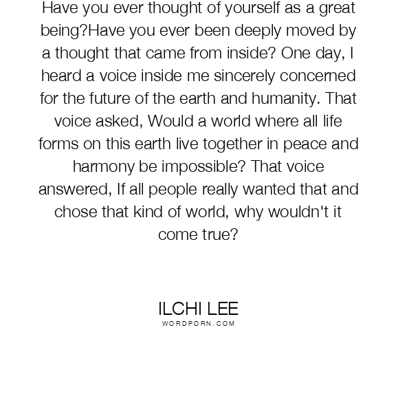 Have you ever thought of yourself as a great being?Have you ever been deeply moved by a thought that came from inside? One day, I heard a voice inside me sincerely concerned for the future of the earth and humanity. That voice asked, Would a world where all life forms on this earth live together in peace and harmony be impossible? That voice answered, If all people really wanted that and chose that kind of world, why wouldn't it come true?