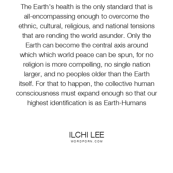 The Earth's health is the only standard that is all-encompassing enough to overcome the ethnic, cultural, religious, and national tensions that are rending the world asunder. Only the Earth can become the central axis around which which world peace can be spun, for no religion is more compelling, no single nation larger, and no peoples older than the Earth itself. For that to happen, the collective human consciousness must expand enough so that our highest identification is as Earth-Humans