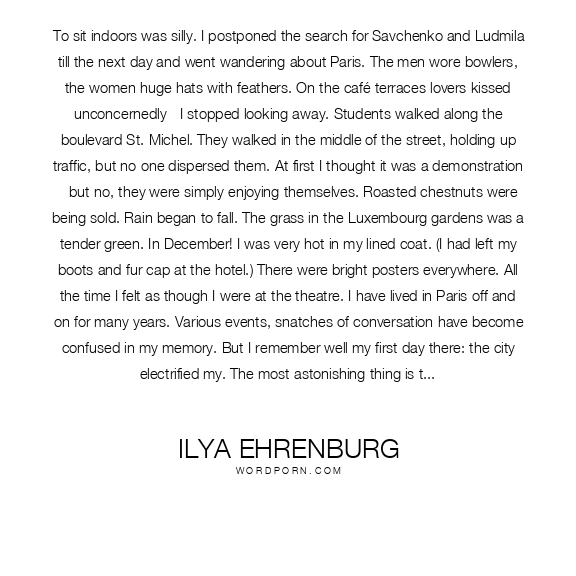 To sit indoors was silly. I postponed the search for Savchenko and Ludmila till the next day and went wandering about Paris. The men wore bowlers, the women huge hats with feathers. On the café terraces lovers kissed unconcernedly - I stopped looking away. Students walked along the boulevard St. Michel. They walked in the middle of the street, holding up traffic, but no one dispersed them. At first I thought it was a demonstration - but no, they were simply enjoying themselves. Roasted chestnuts were being sold. Rain began to fall. The grass in the Luxembourg gardens was a tender green. In December! I was very hot in my lined coat. (I had left my boots and fur cap at the hotel.) There were bright posters everywhere. All the time I felt as though I were at the theatre. I have lived in Paris off and on for many years. Various events, snatches of conversation have become confused in my memory. But I remember well my first day there: the city electrified my. The most astonishing thing is that is has remained unchanged; Moscow is unrecognizable, but Paris is still as it was. When I come to Paris now, I feel inexpressibly sad - the city is the same, it is I who have changed. It is painful for me to walk along the familiar streets - they are the streets of my youth. Of course, the fiacres, the omnibuses, the steam-car disappeared long ago; you rarely see a café with red velvet or leather settees; only a few pissoirs are left - the rest have gone into hiding underground. But these, after all, are minor details. People still live out in the streets, lovers kiss wherever they please, no one takes any notice of anyone. The old houses haven't changed - what's another half a century to them; at their age it makes no difference. Say what you will, the world has changed, and so the Parisians, too, must be thinking of many things of which they had no inkling in the old days: the atom bomb, mass-production methods, Communism. But with their new thoughts they still remain Parisians, and I am sure that if an eighteen-year-old Soviet lad comes to Paris today he will raise his hands in astonishment, as I did in 1908: "A theatre!