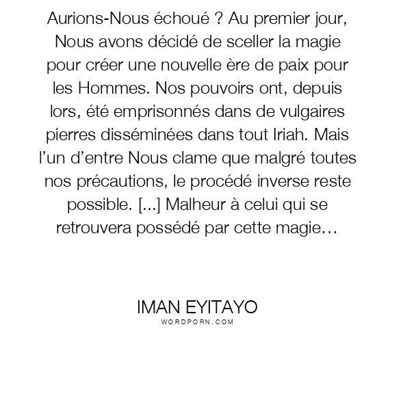 Aurions-Nous échoué ? Au premier jour, Nous avons décidé de sceller la magie pour créer une nouvelle ère de paix pour les Hommes. Nos pouvoirs ont, depuis lors, été emprisonnés dans de vulgaires pierres disséminées dans tout Iriah. Mais l’un d’entre Nous clame que malgré toutes nos précautions, le procédé inverse reste possible. [...] Malheur à celui qui se retrouvera possédé par cette magie…