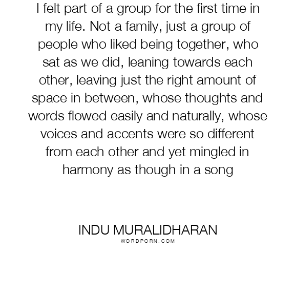 I felt part of a group for the first time in my life. Not a family, just a group of people who liked being together, who sat as we did, leaning towards each other, leaving just the right amount of space in between, whose thoughts and words flowed easily and naturally, whose voices and accents were so different from each other and yet mingled in harmony as though in a song