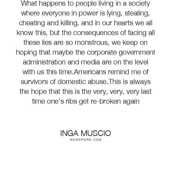What happens to people living in a society where everyone in power is lying, stealing, cheating and killing, and in our hearts we all know this, but the consequences of facing all these lies are so monstrous, we keep on hoping that maybe the corporate government administration and media are on the level with us this time.Americans remind me of survivors of domestic abuse.This is always the hope that this is the very, very, very last time one's ribs get re-broken again