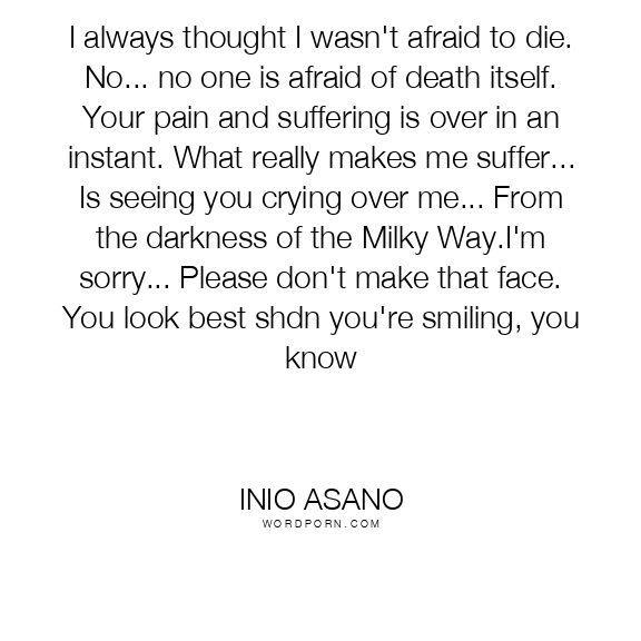 I always thought I wasn't afraid to die. No... no one is afraid of death itself. Your pain and suffering is over in an instant. What really makes me suffer... Is seeing you crying over me... From the darkness of the Milky Way.I'm sorry... Please don't make that face. You look best shdn you're smiling, you know