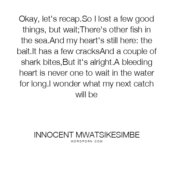 Okay, let's recap.So I lost a few good things, but wait;There's other fish in the sea.And my heart's still here: the bait.It has a few cracksAnd a couple of shark bites,But it's alright.A bleeding heart is never one to wait in the water for long.I wonder what my next catch will be