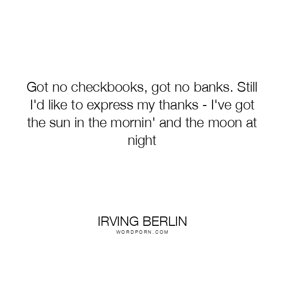 Got no checkbooks, got no banks. Still I'd like to express my thanks - I've got the sun in the mornin' and the moon at night