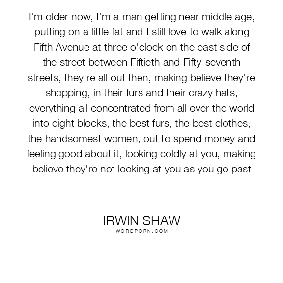 I'm older now, I'm a man getting near middle age, putting on a little fat and I still love to walk along Fifth Avenue at three o'clock on the east side of the street between Fiftieth and Fifty-seventh streets, they're all out then, making believe they're shopping, in their furs and their crazy hats, everything all concentrated from all over the world into eight blocks, the best furs, the best clothes, the handsomest women, out to spend money and feeling good about it, looking coldly at you, making believe they're not looking at you as you go past