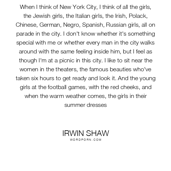 When I think of New York City, I think of all the girls, the Jewish girls, the Italian girls, the Irish, Polack, Chinese, German, Negro, Spanish, Russian girls, all on parade in the city. I don't know whether it's something special with me or whether every man in the city walks around with the same feeling inside him, but I feel as though I'm at a picnic in this city. I like to sit near the women in the theaters, the famous beauties who've taken six hours to get ready and look it. And the young girls at the football games, with the red cheeks, and when the warm weather comes, the girls in their summer dresses