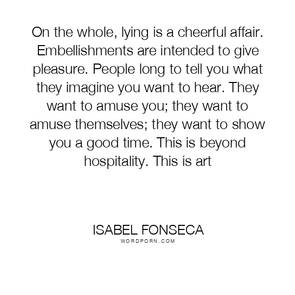 On the whole, lying is a cheerful affair. Embellishments are intended to give pleasure. People long to tell you what they imagine you want to hear. They want to amuse you; they want to amuse themselves; they want to show you a good time. This is beyond hospitality. This is art