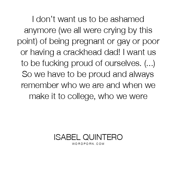 I don’t want us to be ashamed anymore (we all were crying by this point) of being pregnant or gay or poor or having a crackhead dad! I want us to be fucking proud of ourselves. (...) So we have to be proud and always remember who we are and when we make it to college, who we were
