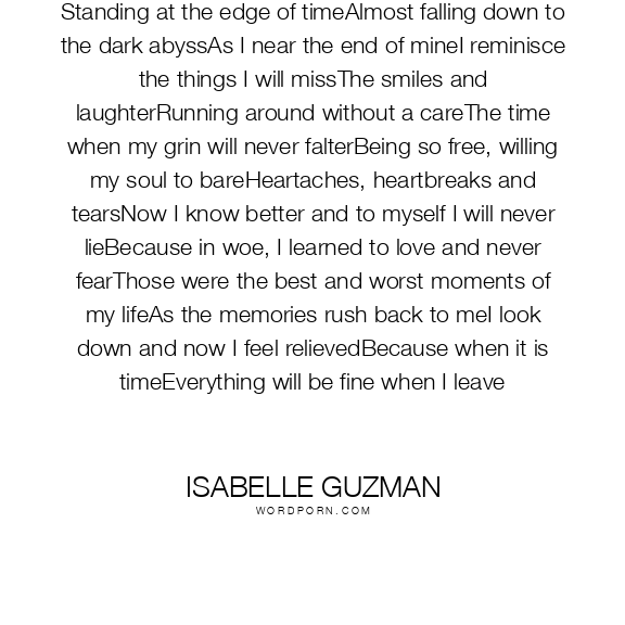 Standing at the edge of timeAlmost falling down to the dark abyssAs I near the end of mineI reminisce the things I will missThe smiles and laughterRunning around without a careThe time when my grin will never falterBeing so free, willing my soul to bareHeartaches, heartbreaks and tearsNow I know better and to myself I will never lieBecause in woe, I learned to love and never fearThose were the best and worst moments of my lifeAs the memories rush back to meI look down and now I feel relievedBecause when it is timeEverything will be fine when I leave