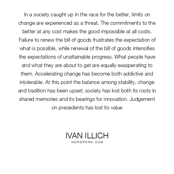In a society caught up in the race for the better, limits on change are experienced as a threat. The commitments to the better at any cost makes the good impossible at all costs. Failure to renew the bill of goods frustrates the expectation of what is possible, while renewal of the bill of goods intensifies the expectations of unattainable progress. What people have and what they are about to get are equally exasperating to them. Accelerating change has become both addictive and intolerable. At this point the balance among stability, change and tradition has been upset; society has lost both its roots in shared memories and its bearings for innovation. Judgement on precedents has lost its value
