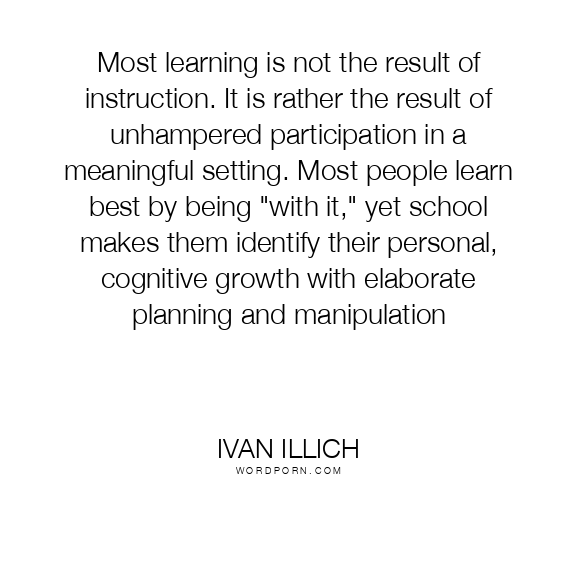 Most learning is not the result of instruction. It is rather the result of unhampered participation in a meaningful setting. Most people learn best by being "with it," yet school makes them identify their personal, cognitive growth with elaborate planning and manipulation