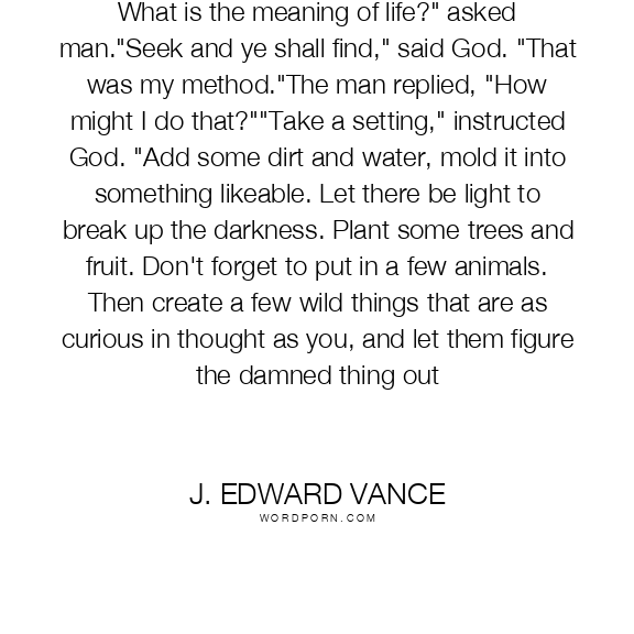 What is the meaning of life?" asked man."Seek and ye shall find," said God. "That was my method."The man replied, "How might I do that?""Take a setting," instructed God. "Add some dirt and water, mold it into something likeable. Let there be light to break up the darkness. Plant some trees and fruit. Don't forget to put in a few animals. Then create a few wild things that are as curious in thought as you, and let them figure the damned thing out