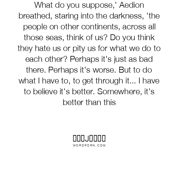 What do you suppose,' Aedion breathed, staring into the darkness, 'the people on other continents, across all those seas, think of us? Do you think they hate us or pity us for what we do to each other? Perhaps it's just as bad there. Perhaps it's worse. But to do what I have to, to get through it... I have to believe it's better. Somewhere, it's better than this