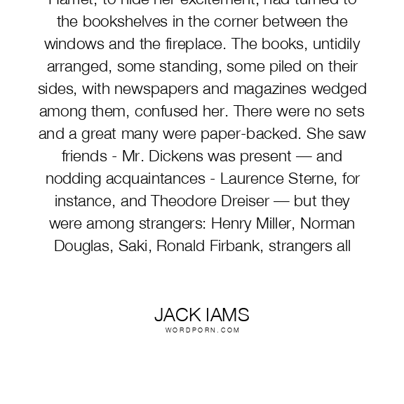 Harriet, to hide her excitement, had turned to the bookshelves in the corner between the windows and the fireplace. The books, untidily arranged, some standing, some piled on their sides, with newspapers and magazines wedged among them, confused her. There were no sets and a great many were paper-backed. She saw friends - Mr. Dickens was present — and nodding acquaintances - Laurence Sterne, for instance, and Theodore Dreiser — but they were among strangers: Henry Miller, Norman Douglas, Saki, Ronald Firbank, strangers all