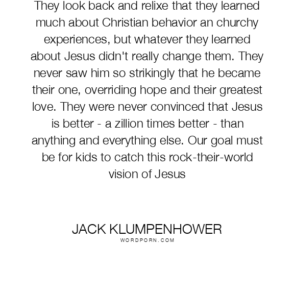 They look back and relixe that they learned much about Christian behavior an churchy experiences, but whatever they learned about Jesus didn't really change them. They never saw him so strikingly that he became their one, overriding hope and their greatest love. They were never convinced that Jesus is better - a zillion times better - than anything and everything else. Our goal must be for kids to catch this rock-their-world vision of Jesus