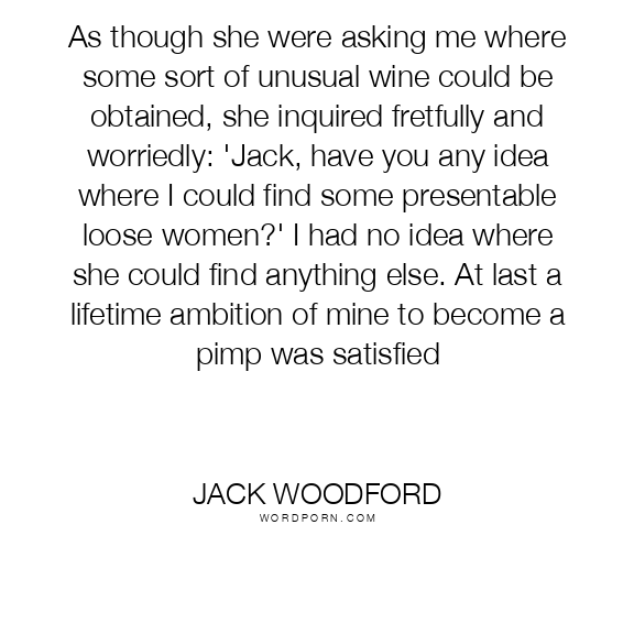 As though she were asking me where some sort of unusual wine could be obtained, she inquired fretfully and worriedly: 'Jack, have you any idea where I could find some presentable loose women?' I had no idea where she could find anything else. At last a lifetime ambition of mine to become a pimp was satisfied