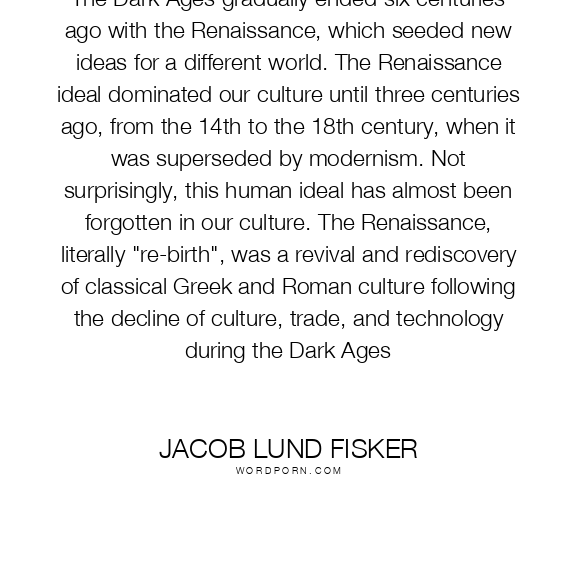 The Dark Ages gradually ended six centuries ago with the Renaissance, which seeded new ideas for a different world. The Renaissance ideal dominated our culture until three centuries ago, from the 14th to the 18th century, when it was superseded by modernism. Not surprisingly, this human ideal has almost been forgotten in our culture. The Renaissance, literally "re-birth", was a revival and rediscovery of classical Greek and Roman culture following the decline of culture, trade, and technology during the Dark Ages