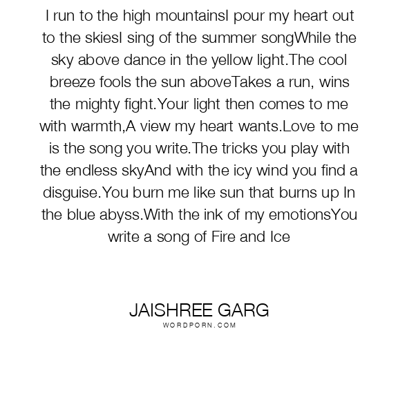 I run to the high mountainsI pour my heart out to the skiesI sing of the summer songWhile the sky above dance in the yellow light.The cool breeze fools the sun aboveTakes a run, wins the mighty fight.Your light then comes to me with warmth,A view my heart wants.Love to me is the song you write.The tricks you play with the endless skyAnd with the icy wind you find a disguise.You burn me like sun that burns up In the blue abyss.With the ink of my emotionsYou write a song of Fire and Ice