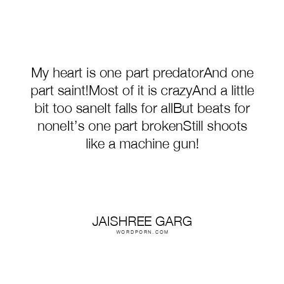 My heart is one part predatorAnd one part saint!Most of it is crazyAnd a little bit too saneIt falls for allBut beats for noneIt’s one part brokenStill shoots like a machine gun!