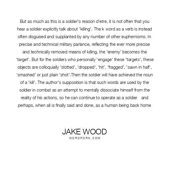 But as much as this is a soldier's reason d'etre, it is not often that you hear a soldier explicitly talk about 'killing'. The k-word as a verb is instead often disguised and supplanted by any number of other euphemisms. In precise and technical military parlance, reflecting the ever more precise and technically removed means of killing, the 'enemy' becomes the 'target'. But for the soldiers who personally 'engage' these 'targets', these objects are colloquially 'slotted', 'dropped', 'hit', 'fragged', 'sawn in half', 'smashed' or just plain 'shot'.Then the soldier will have achieved the noun of a 'kill'. The author's supposition is that such words are used by the soldier in combat as an attempt to mentally dissociate himself from the reality of his actions, so he can continue to operate as a soldier - and perhaps, when all is finally said and done, as a human being back home