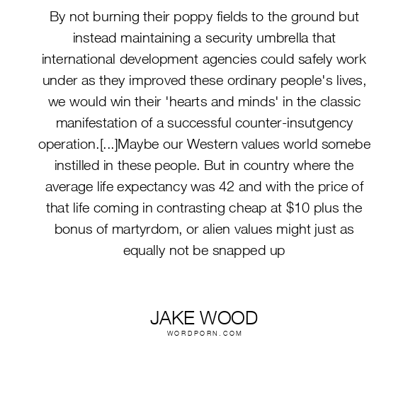 By not burning their poppy fields to the ground but instead maintaining a security umbrella that international development agencies could safely work under as they improved these ordinary people's lives, we would win their 'hearts and minds' in the classic manifestation of a successful counter-insutgency operation.[...]Maybe our Western values world somebe instilled in these people. But in country where the average life expectancy was 42 and with the price of that life coming in contrasting cheap at $10 plus the bonus of martyrdom, or alien values might just as equally not be snapped up