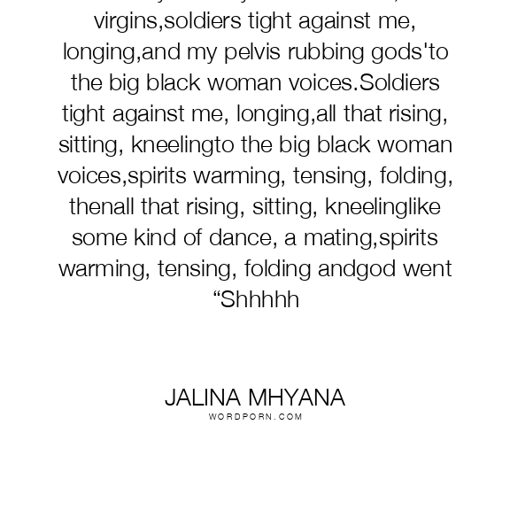 Every Sunday behind bibles, virgins,soldiers tight against me, longing,and my pelvis rubbing gods'to the big black woman voices.Soldiers tight against me, longing,all that rising, sitting, kneelingto the big black woman voices,spirits warming, tensing, folding, thenall that rising, sitting, kneelinglike some kind of dance, a mating,spirits warming, tensing, folding andgod went “Shhhhh